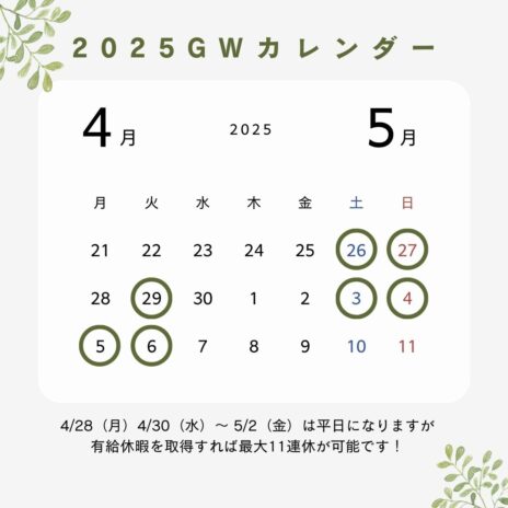 2025年のゴールデンウィーク(GW)は、平日に4日間有給を取れば4月26日(土)から5月6日(火)までの最大11連休となります!特に、4月29日(昭和の日)と5月3日(憲法記念日)、5月4日(みどりの日)、5月5日(こどもの日)が祝日となり、多くの人が旅行を計画しやすい時期です。