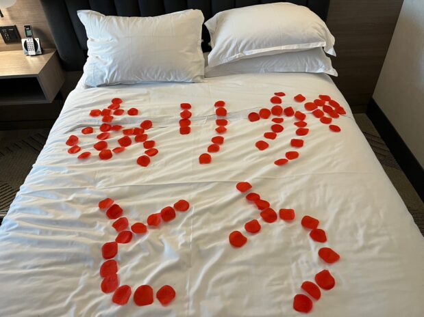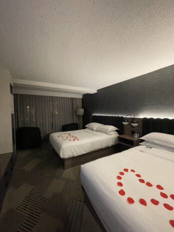 夫はベッドにバラの花びら(最初入室した時にハートを描いていたもの)で「ありがとう」と残していました。チェックアウトは、受付の方が優しい英語で話してくださり、なんとか支払い(ルームサービスの朝食代)を済ませられました。昨日バスの予約確認の電話が繋がらなかったので少し不安でしたが、ナイアガラエアバスも時間通りに到着し、無事にトロント空港へつきました。帰りのバスは日本の方も多く、大変居心地が良かったです。