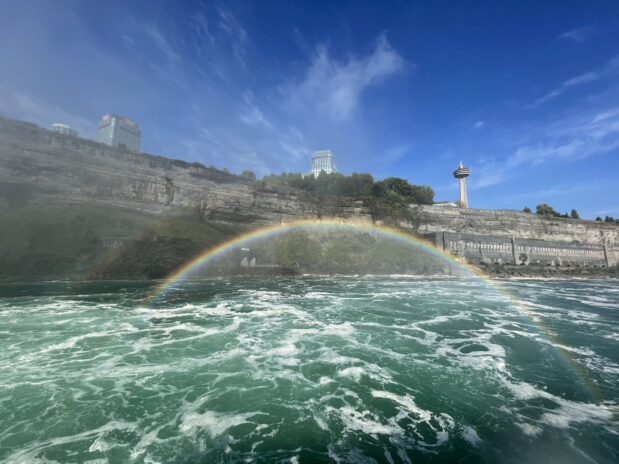 10:00 テーブルロックへ行きカフェで一休み。テーブルロックへ行く途中が、滝の水飛沫がすごく、服がびしょ濡れになりました。間近で見るカナダ滝の迫力は凄まじく、自然の大きな力に圧巻されました。3日目に一緒にオーロラ観測をした女性の方が、昔吹っ切れないことがあった時にナイアガラの滝を見に行ったことがあると仰っていましたが、確かにこの滝を見たら、自分が抱えてる問題なんてどうってことないと思わされてしまうな、と感じました。