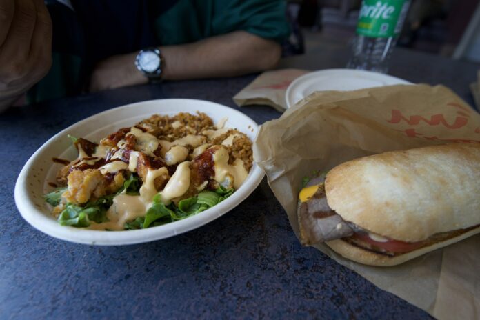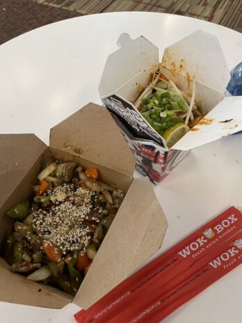 10:00 エドモントン空港到着。この空港は初日に4時間いたので、もう懐かしい気持ちに。イエローナイフ発の飛行機が遅れていたため、乗り継ぎの時間が1時間ほどしかありませんでしたが、お腹が空いたのでWOKBOXでお昼ご飯を食べて待ちました。二人で注文したジンジャービーフとチキンクリスピーは甘味が強い味付けでしたが、タイ米のよく合う味で大変美味しくいただきました。