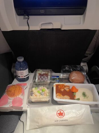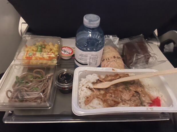 食事は昼食(生姜焼き丼?)、軽食(ツナサンドイッチ)、夜食?(焼きそば)が出ました。3食も出ると思わなかったので空港で昼食食べたの失敗したなーと思いましたが、機内食は量が少ないので問題ありませんでした。おやつのブラウニーが美味しかったです。