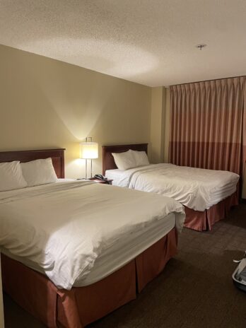 2:30 ホテルに到着。古いようでしたが、トイレもお風呂も問題なく使え、電子レンジやコーヒーメーカーも用意してあったので快適でした。お腹が空いたので日本から持参したカップ麺を食べて寝ました。