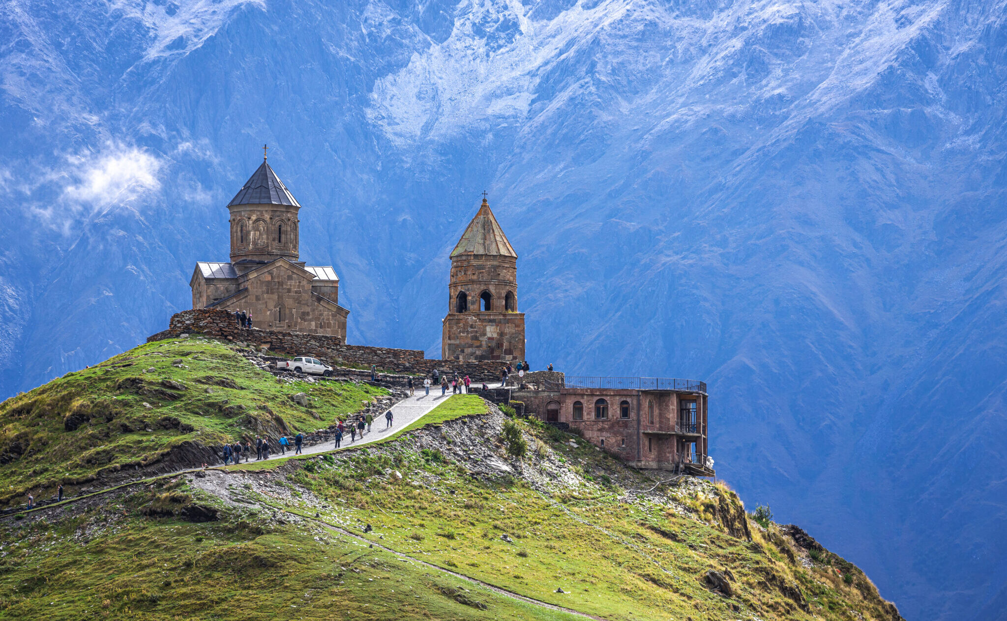 トビリシから北へ、軍用道路を車で約3時間。コーカサス山脈の雄大な自然に抱かれた、ジョージア随一の絶景スポットです。