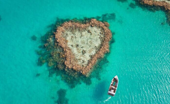 ハーディーリーフ内のハート型サンゴ礁への遊覧飛行はハミルトン島からのみ。世界中のカップルが憧れる景色です。