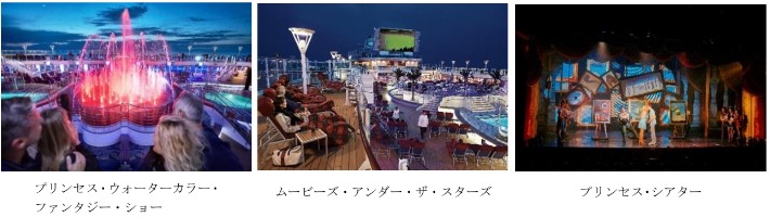 プリンセス・ウォーターカラー・ファンタジー・ショーは、音楽に合わせて 10 メートルの高さまで上がる噴水とイルミネーションが繰り広げられる魅力的なプログラムです。ムービーズ・アンダー・ザ・スターズは、69,000 ワットの音響システムと 28 m2以上のスクリーンを備えた屋外シアターで、映画、コンサート、スポーツイベントなどをお楽しみいただけます。プリンセス・シアターでは、受賞歴のあるラスベガス・スタイルのプロダクション・ショーをはじめとする華やかなプログラムを上演します。