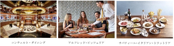メイン・ダイニング‐船内には、シンフォニー・ダイニング、アレグロ・ダイニング、コンチェルト・ダイニングの3か所のメイン・ダイニングで毎晩フルコースディナーをお楽しみいただけます。